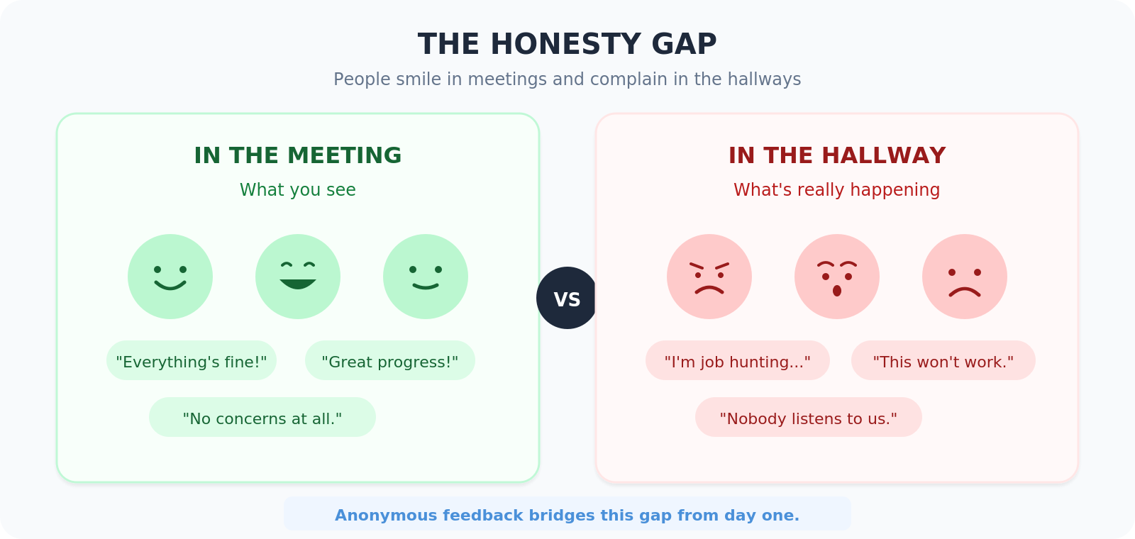 But to truly observe, you need honest information. And honesty, in a brand new management relationship, is rare. People smile in meetings and complain in the hallways. That is the first problem this guide helps you solve.