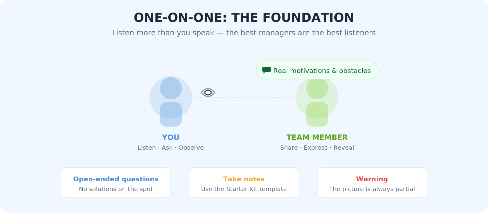 Listen more than you speak. The best managers are the best listeners. Take notes, ask open-ended questions, and resist the urge to offer solutions on the spot.