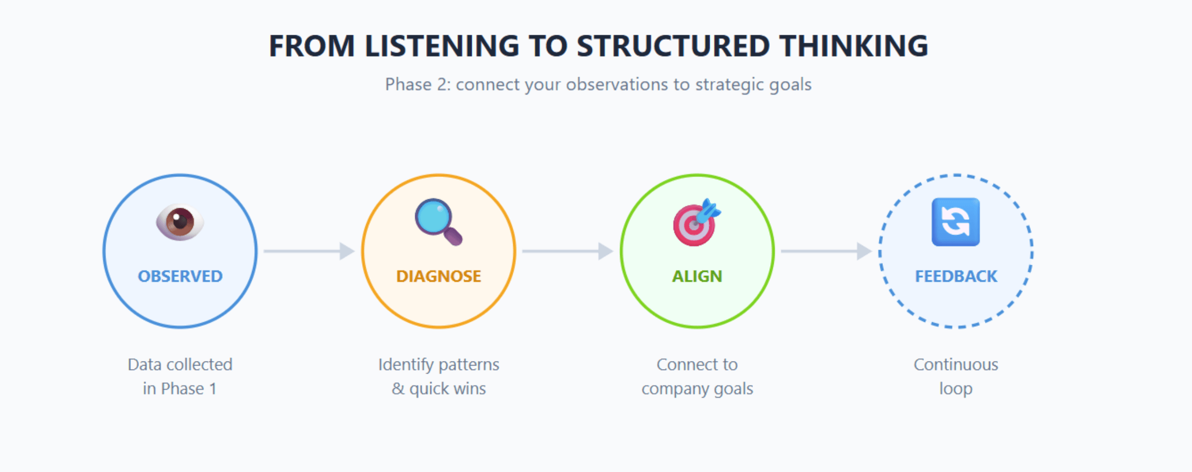 Objective: connect your observations to the company's strategic goals. You are beginning to move from listening to structured thinking.
