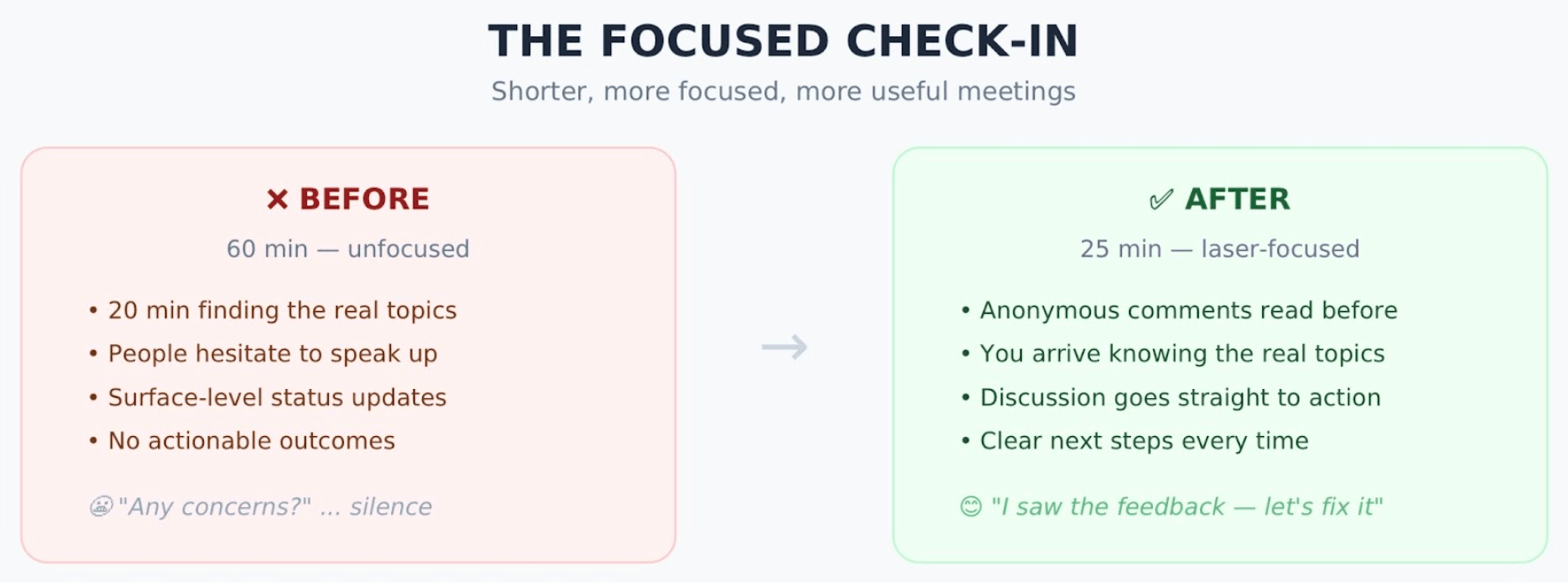At this stage, TeamMood can also transform the quality of your team meetings. By accessing the week's anonymous comments before each collective check-in, you arrive knowing exactly what is weighing on the team without spending the first twenty minutes fumbling around to find the real topics. Meetings become shorter, more focused, and more useful.