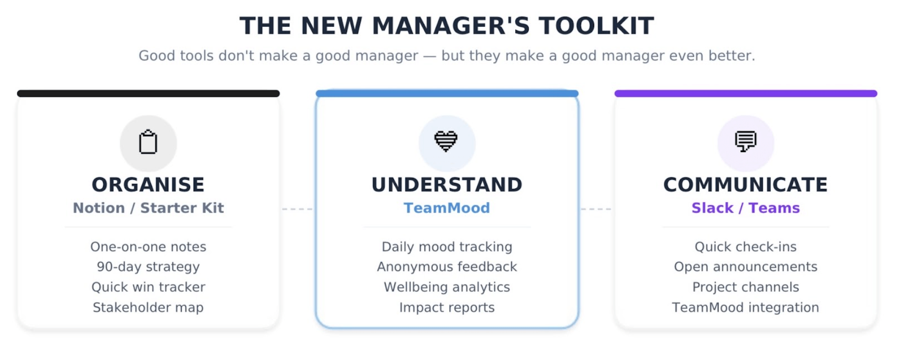Notion: To centralise all your management context and lose nothing: one-on-one notes with reusable templates, meeting agendas and decisions taken, your living and evolving 90-day strategy, a quick win tracker, and a stakeholder map. If you do not want to start Notion from scratch, the downloadable starter kit covers all of this in a Google Sheets format that is ready to use immediately, with no setup required. One single place where all context is centralised, from day one.