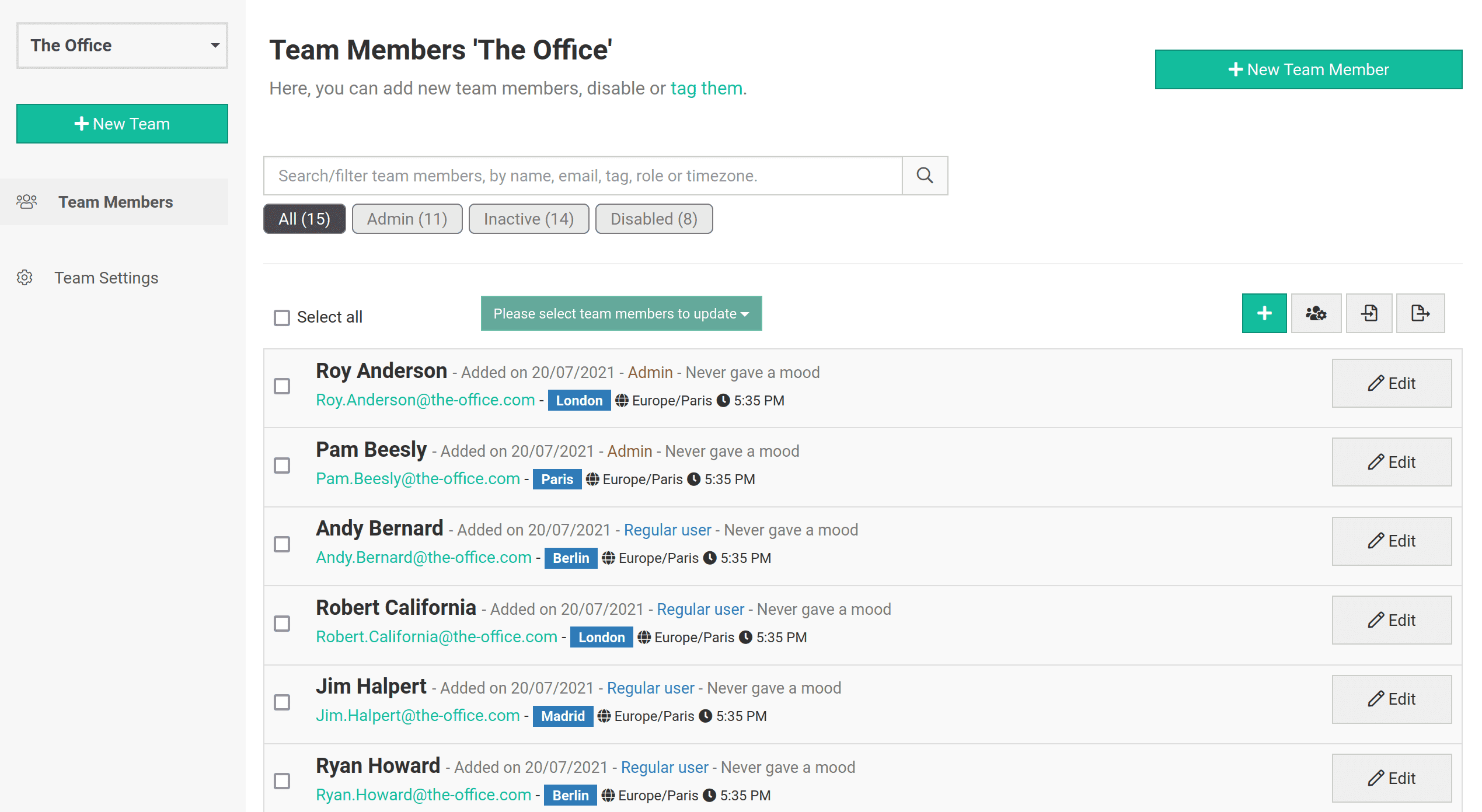 Writing a comment every day can quickly become boring for your teammates. With moods, a single click allows you to get useful information on their wellness and keep boredom out for longer.